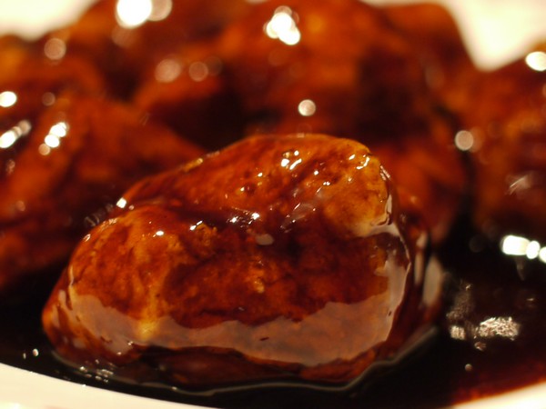 糸引くほどに、まるで水飴をからませたようなコッテリとした黒酢ソースをタップリ、肉に塗りつけながら口に運ぶ。