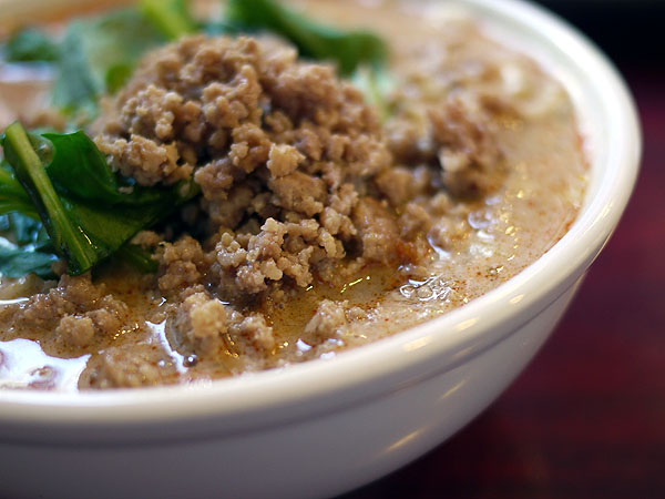 ここの名物、自家製ラー油をタップリ入れても、胡麻の甘味がそれを受け止めまるで口では辛くは感じぬ。