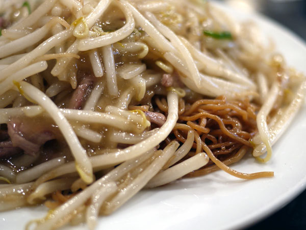 ゴワゴワとしてボソッと乾いた細い広東風の麺が一層、モヤシのシャキシャキ引き立てて、前歯が喜ぶ歯のご馳走。