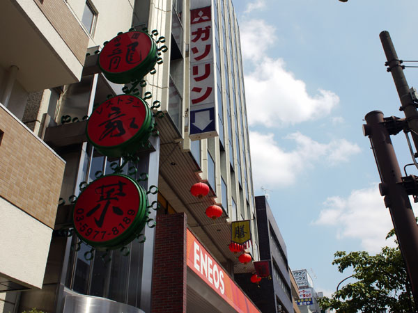 二階の突き出た軒下に、真っ赤な中華ランタンと旗がたなびく。