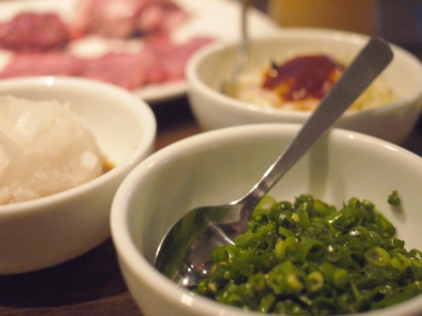 脇役ネギ…、っていう薬味といればいいのか、タレと言えばいいのか、刻んだネギに味をくわえた小皿が何種類も用意されてて、それと一緒に肉をどうぞ!という提案。