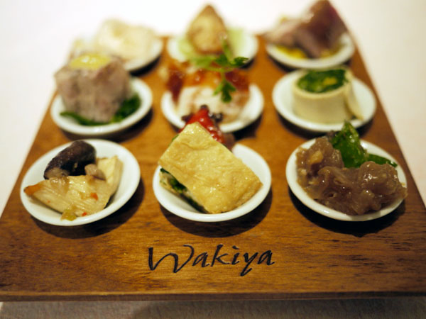 丸い穴の開いた板にズラっと並んだ杯大のお皿の中に、盛られた季節の前菜さまざま。