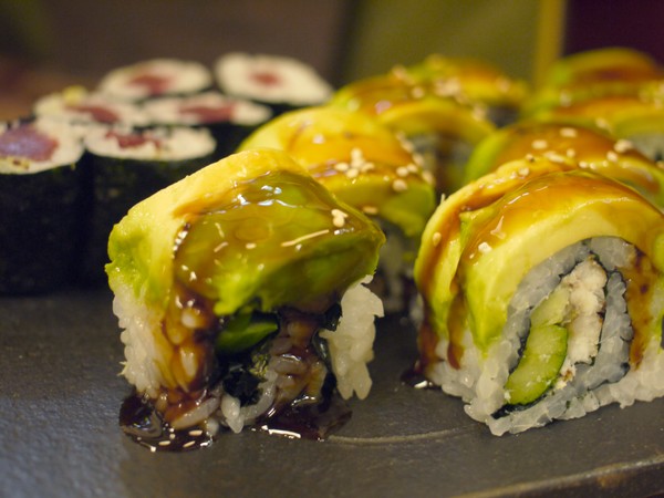 カニのほぐし身をマヨネーズで和えたのをまずは芯にして、穴子とアボカドをロールに巻いて、甘いタレをタップリと塗る。