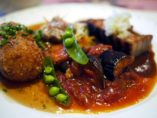 けれどメニューに、豚のグリエとカニのコロッケの盛り合わせ、と書いてあってあまりの魅力にクラクラきました。