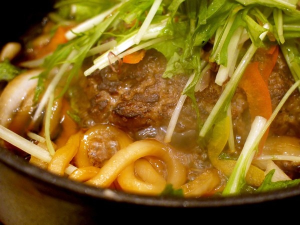 それをときほぐして、ハンバーグをつけながら食べてもいいし、鍋の中に流し込み、具材を卵とじのようにしてもよい。
