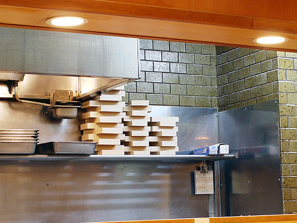 油を使って食べ物揚げる、だから汚れて当然のステンのダクトもピカピカで、そこにちょこんとサンドイッチのお土産用の経木の折りがキレイに積まれて並んでる。