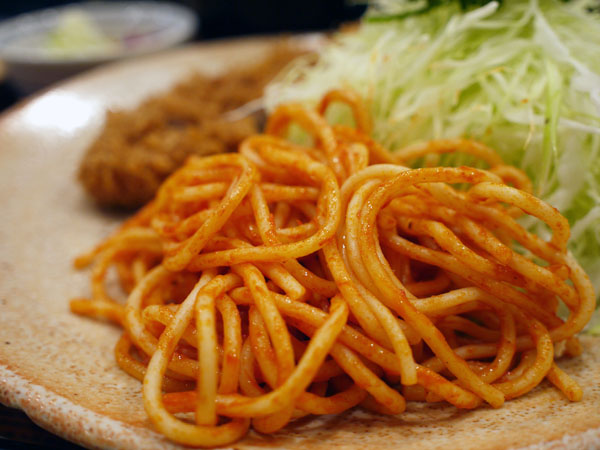 味わい単調な安い料理に、味の変化をとナポリタンをつけるなんともやさしいところが心憎い。