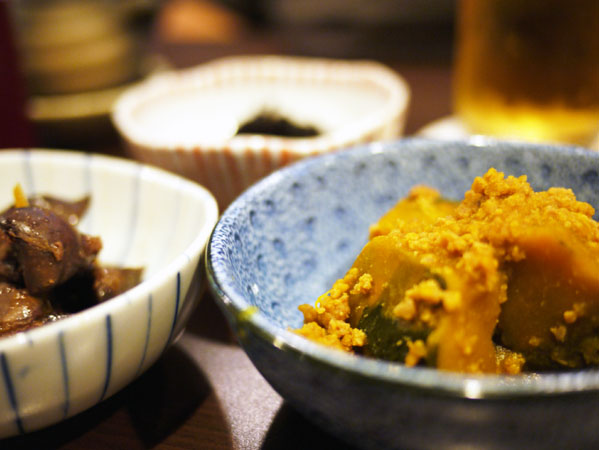 甘く煮込んだホクホクのカボチャにタップリ鶏肉そぼろがくっついていて、一緒に食べるとカボチャで作ったコロッケみたいな味わいになる。