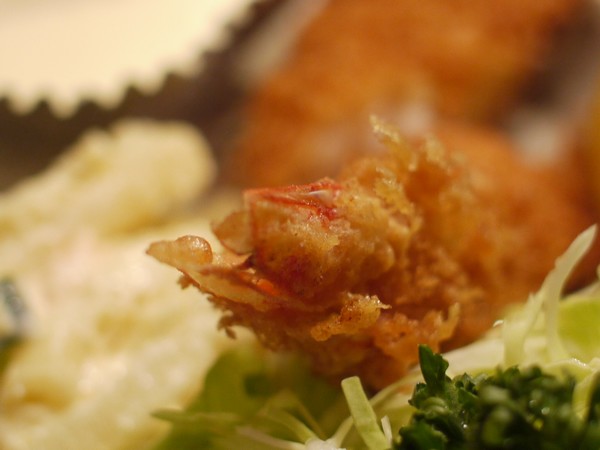 ムチッと食感たしかなエビを、細かなパン粉でギッシリつつみ、油の中で蒸し焼きにした。