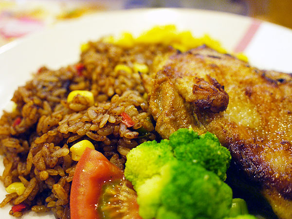タンドリーチキンのグリルとドライカレーのプレートディナー。
