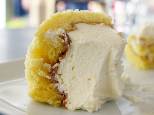 カステラ色で、でもシットリで、フォークを当てると力強く跳ね返す弾力のあるシッカリとした生地でタップリ包まれた、つややかクリーム。
