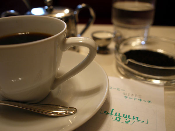 挽いたコーヒー豆が敷き詰められた灰皿に、スポーツ新聞が置かれたテーブル。