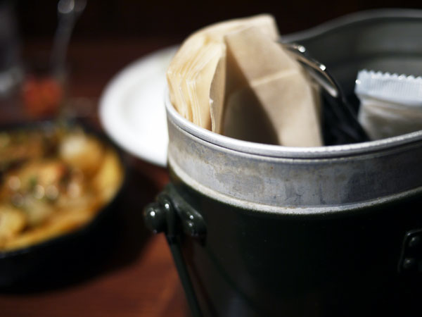 料理をたのむと、まず飯盒とお水のグラスがコトンときます。