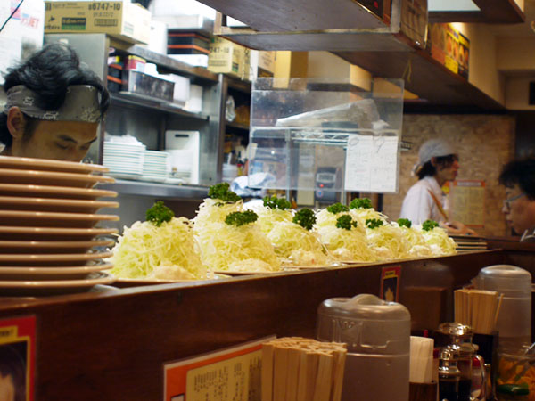 カウンターの上にズラッとならんでスタンバイしてるキャベツの千切り。