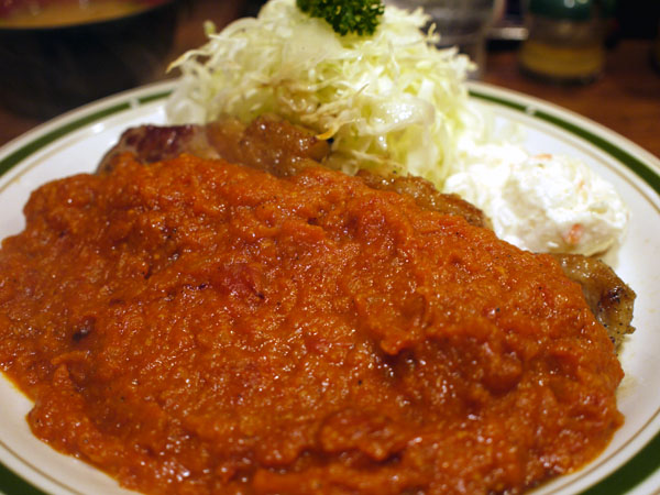 みじん切りにしたタマネギをソテして薄切りステーキの上に押し付けるように乗っけて食べる、シャリアピンステーキをトマト風味にアレンジしたもの…、みたいな感じ。