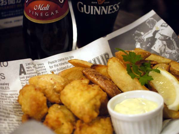 フィッシュアンドチップスにモルトヴィネガーをタップリかけて、ギネスビールをゴキユっと煽る。