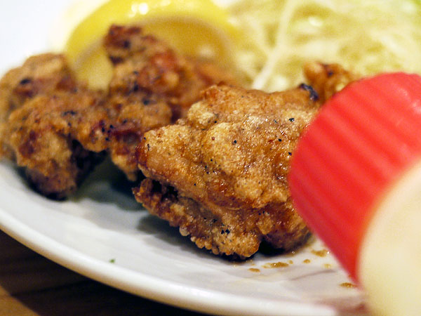 醤油風味のタレをタップリ吸い込んだ鶏モモ肉に粉をはたいてガッシリ揚げた、酒のつまみにこの上ないほど良くできのコレ。