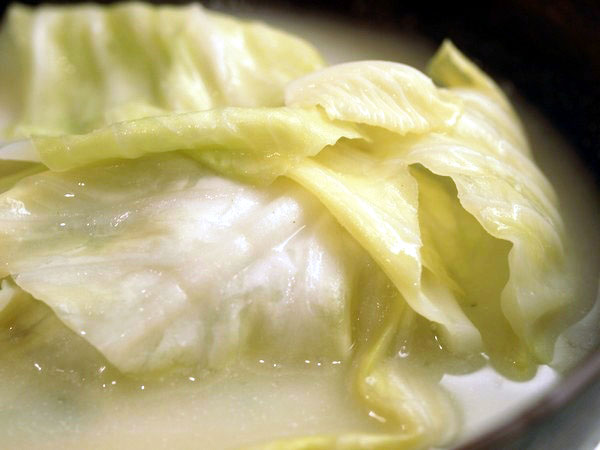 しゃもじで押さえて、浮き上がろうとする元気な葉っぱをお鍋の中に沈めてしばらく、キャベツの色が鮮やかな若草色に変わるのを待つ。