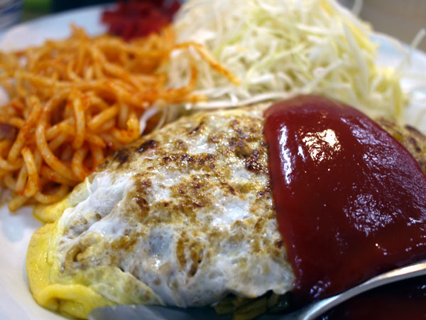 千切りキャベツにスパゲッティ…、というまさに喫茶店的姿形で、でもこれが普通の「オムレツでくるんだ焼きそば」ではないのがステキなところでござります。