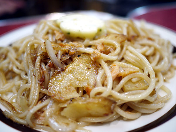 ホロホロ、炒め上げられてなかば粉化した魚卵がビッシリ、麺に貼り付きほんのりピンク色に染まったたらこのスパゲッチ。