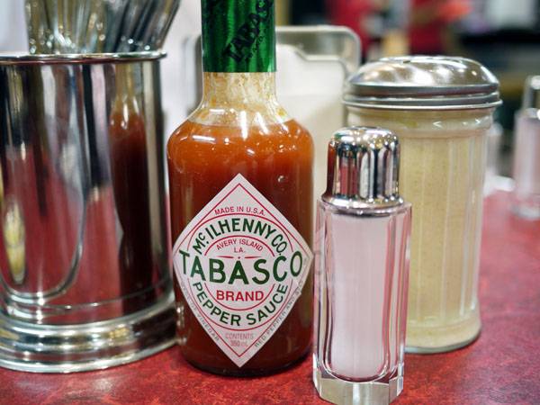 テーブルの上には特大サイズのタバスコと、粉チーズがタップリ入ったボトルに塩。