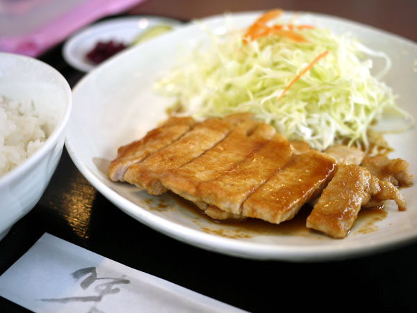 一緒に行った4人で手分けしいろんなものを食べてみましょう…、とボクは豚の生姜焼きを選んでたのむ。