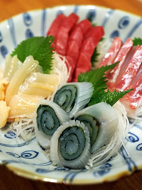 それから刺身…、鯛にマグロにつぶ貝にイカ。