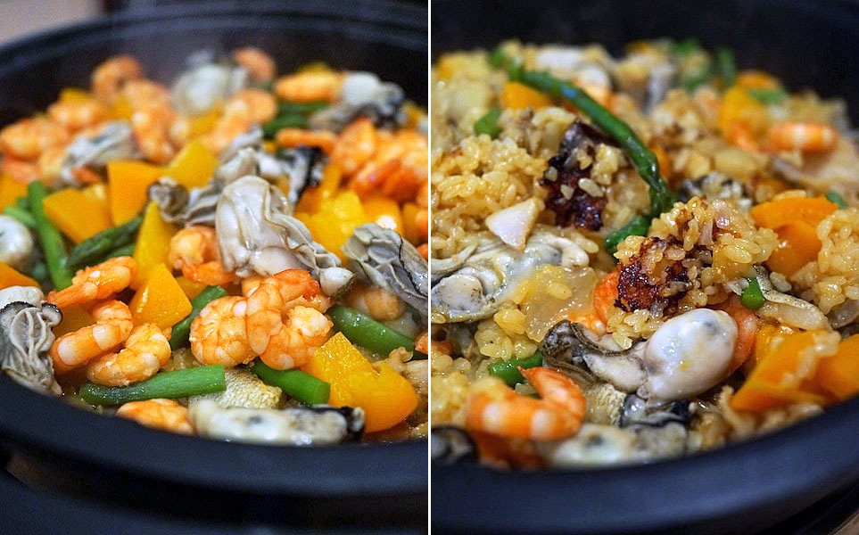 鍋の水気がなくなったらば、一旦、蓋とりパプリカ、アスパラガスを散らしてエビをもどして牡蠣をのっけて保温モードでしばらく蒸らす。