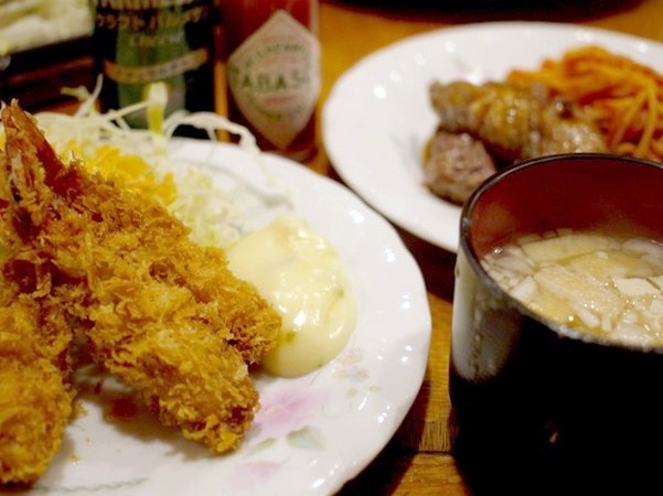 ジンジャー風味の醤油ソースをタップリかけてステーキぱくつき、タルタルソースにまみれたフライでご飯を汚す。