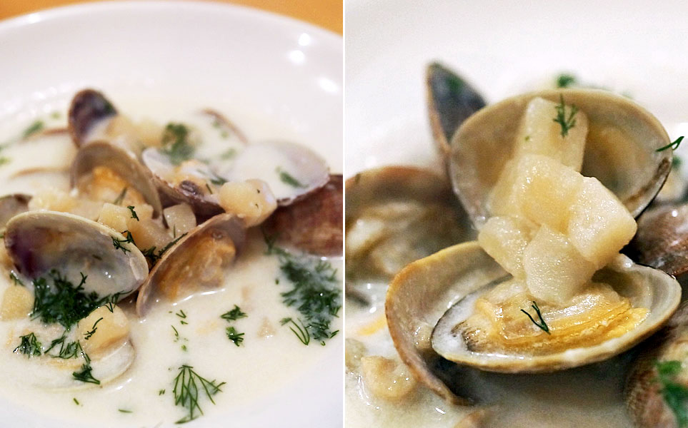 状態のよいアサリをミルクてほどよく炊いて、出汁をださせてそこにキャンベルのクラムチャーだーの缶詰パカリ。コトコト煮たらお皿に移してディル、パラリ。