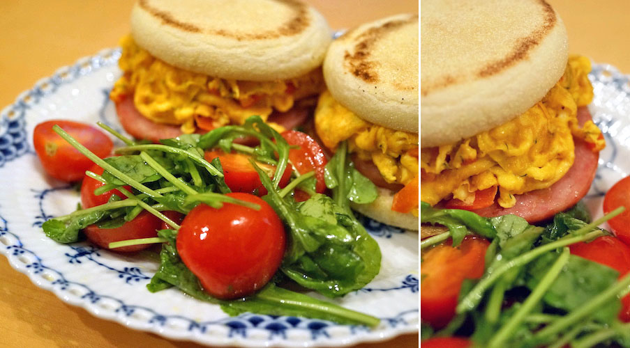 二枚に開いたマフィンを両面。その表面がカサカサ乾いて小麦が焼ける匂いがしてきたところで、マヨネーズ、プチュ。ソーセージパテに玉子をふわりとのっけてケチャップ、プチュリとほどこし出来上がり。
