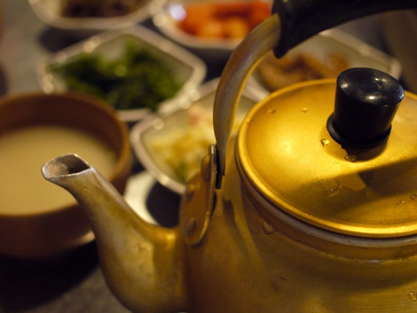 おこげマッコリ、やかんでたのんで韓国おでんの煮つけやキムチでゴックリとやる。
