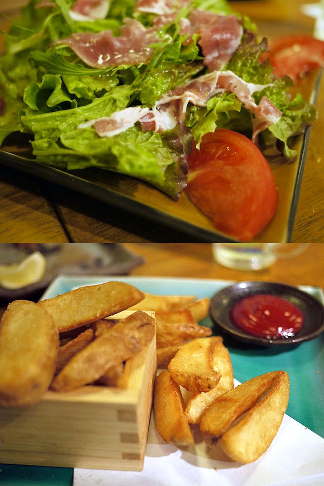 鶏の唐揚げなどなどたのみ、そうだ、野菜を食べなくちゃ…、と生ハムサラダをたのんで食べる。