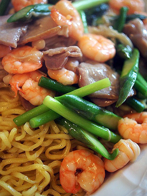 ムッチリとした麺の食感…、エビのプリプリ、ニンニクの茎のクシュクシュとした食感がとてもたのしく何よりエビの出汁がおいしくて、口の中がニッコリなります。