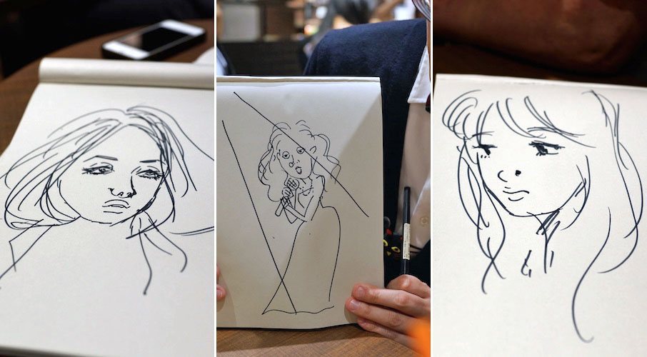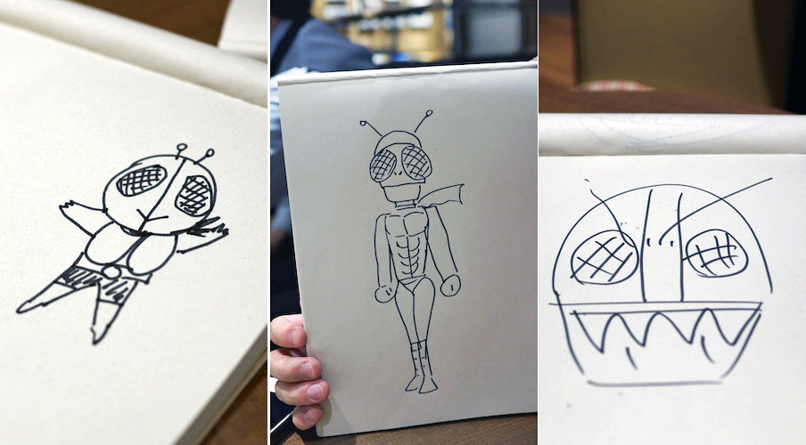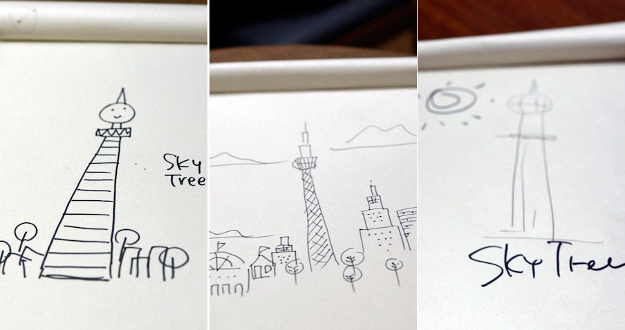 試しに、スカイツリーってお題を出したら三人三様。一番左が女子に人気のあるファッション系のイラスト作家。真ん中はクレイを使った作品を作る造形作家。一番左は漫画家さんで、それぞれ自分の作風が滲みだすようなオモシロさ。