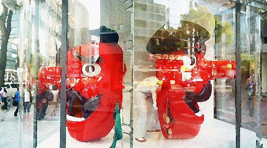 Olaf Breuningってスイス出身のアーティストの作品らしく、外国の人は面白がってパチパチ写真を撮ってるけれど、銀座大好きなおばさまたちは、見ちゃいけないものを見てしまったみたいな表情…、そういう意味でこれは立派なアートなのかもしれないですな、ワカラナイ(笑)。