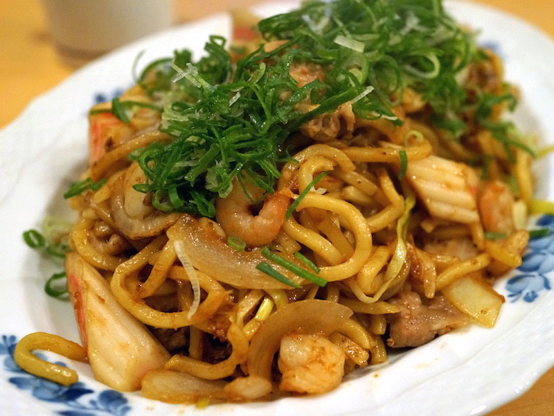 太目の麺を放り込み、ソースに魚粉を振り込んで再びカシャカシャ。麺がほぐれて具材とほどよく混ざったところでお皿に移してネギ、散らす。