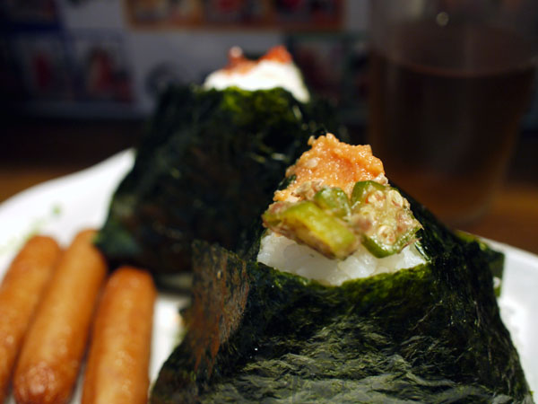 紀州梅のシンプルおむすびと、オクラと明太子のコラボおむすび。