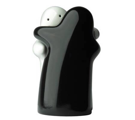 塩と胡椒の入れ物がハグしあって一対をなす。