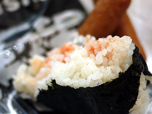 たらこと明太子を一緒にむすんでもらったモノで、三角形のその一角にちょこんと焼いたたらこと生の明太子。