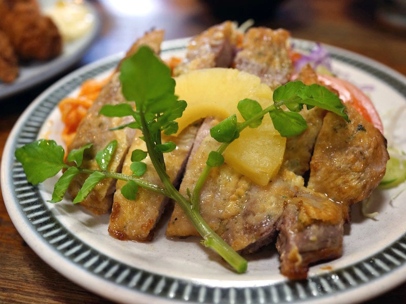 缶詰パイナップルの甘みが豚に旨味をくれて、パイナップルには豚の脂と塩味がつく…、どちらもそれぞれおいしくなっていくのがたのしい。