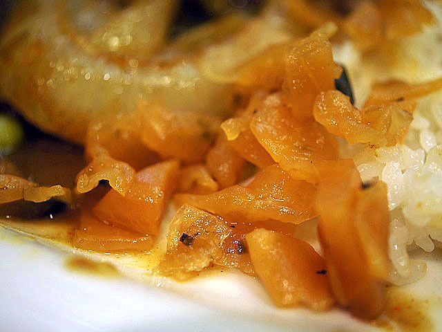 サクサクとしたこれまた植物油で揚げた軽い衣と、フックラとしたタラの身が、カレーのルーと混じっておいしい。