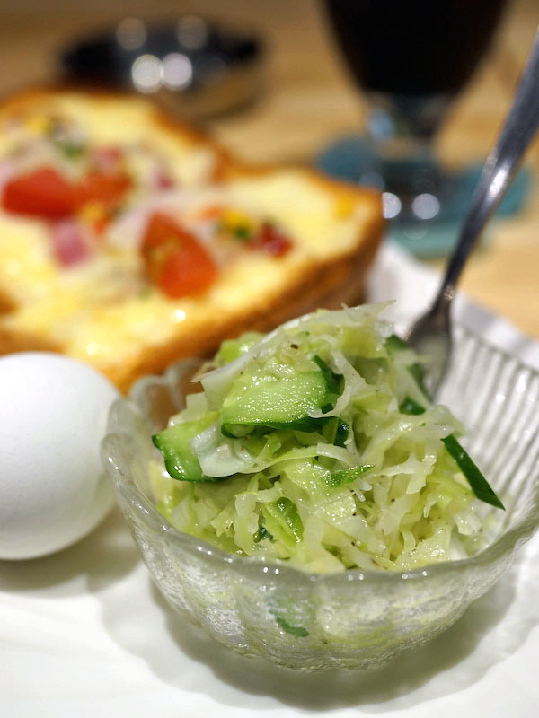 ここの朝食セットには必ずついてやってくるレタスとキュウリで作ったおひたしみたいな千切りサラダ。茹でた玉子がお皿に一緒にやってくる。