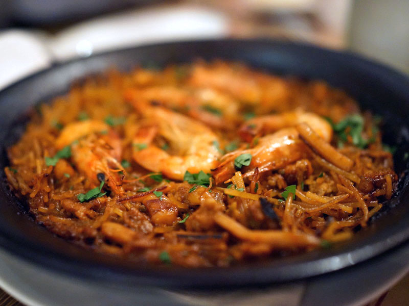 パスタのパエリア。魚を具材にしっとり炊けた極細パスタ。パエリア鍋に触れたところはパリッと、ちょうどもんじゃのこげてバリバリ焼けたところのような食感でおいしいものをたくさん食べた舌にもおいしい。