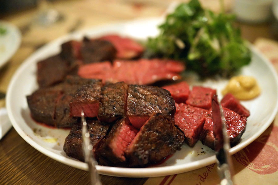 厚みのある肉を焼いて、一口大に切る。口に入れるとクチャっと潰れて、肉がネットリからみつく。炭の香りに脂の甘み。スッキリとした酸味が後味ひきしめる、そのまま食べても十分おいしく、そこにマスタード、あるいは岩塩をあわせて食べると、旨味や甘み、辛味に渋味とさまざまな味がくわわりたのしい。