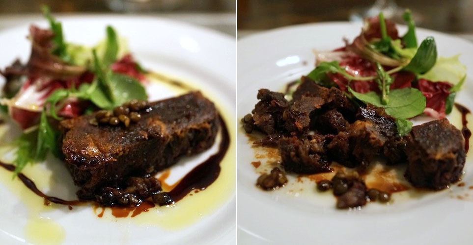 焼きテリーヌという料理で、牛すじ肉をトロトロに煮て繊維をほぐしたところに緑のレンズ豆をギッシリ詰め込みテリーヌ型で固めたモノ。