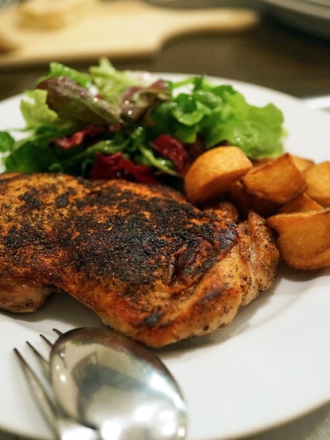 フライパンにのっけた鶏を、時折、上から押し付けながらシッカリ焼くから皮から滲んだ脂でまるで揚がったように皮が仕上がる。