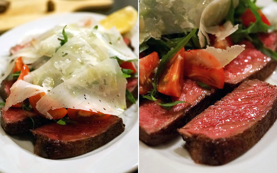 分厚い牛肉を表面焦がして焼き上げて、アルミホイルでくるみ休ませる。すると中はキレイなロゼ色。みずみずしいまま仕上がって、程よき厚さに切ったのをお皿に並べて、ルッコラ、トマトにパルミジャーノをたっぷりほどこす。