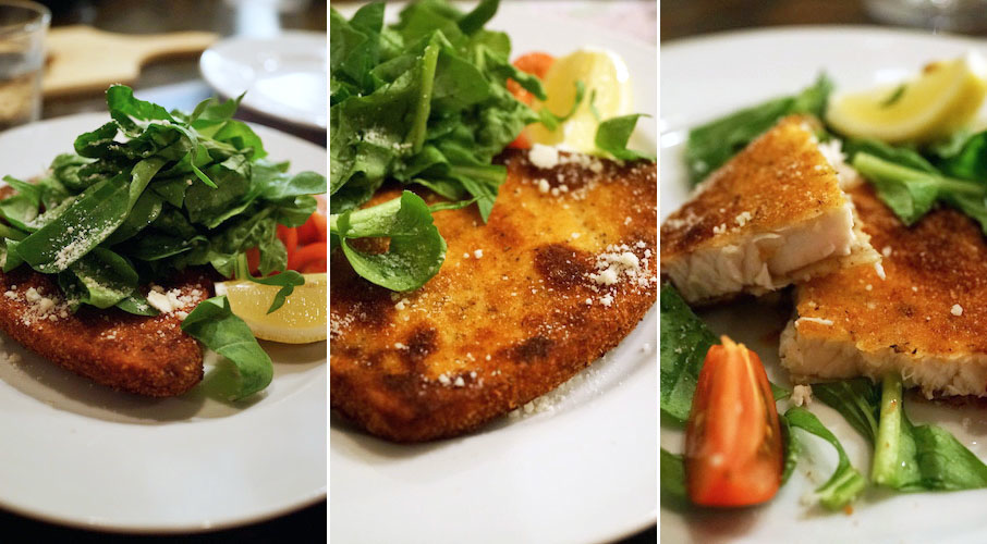 大きなカジキに細かなパン粉をギッシリまとわせ、オリーブオイルの中で焼く。熱した油をかけまわしつつ、時間をかけてユックリ、じっくり。しかもサックリ揚げていき、外はサクサク。