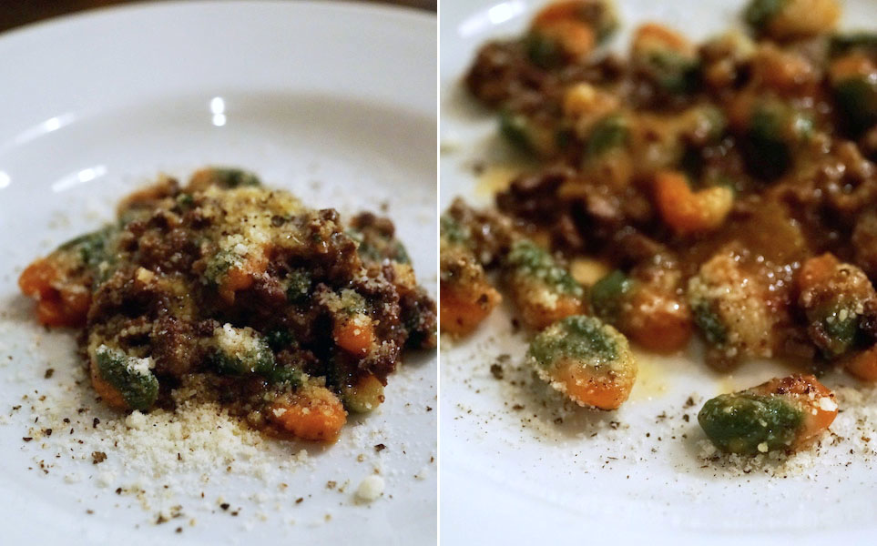 仔羊の肉を包丁で叩いて粗挽きのようにしたのを煮込んでラグーに仕上げたモノをまとわせた、芋虫みたいな小さなパスタ。